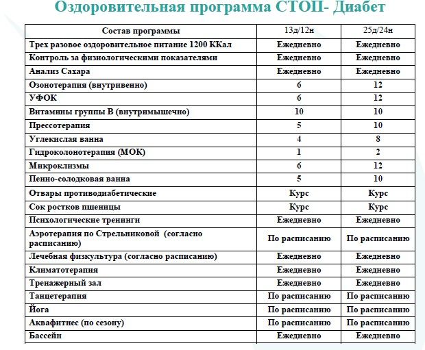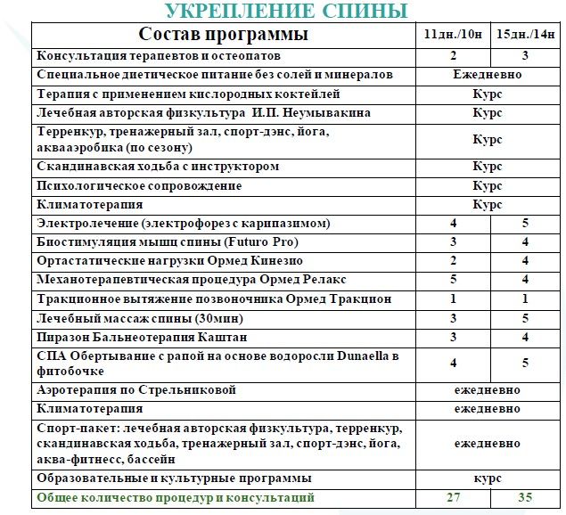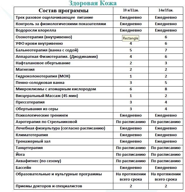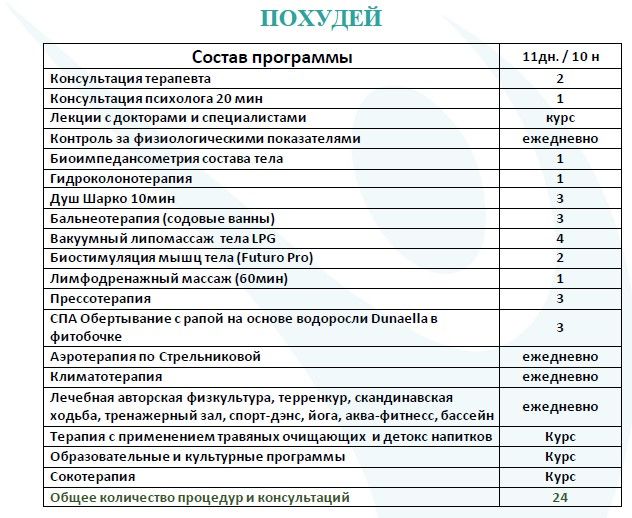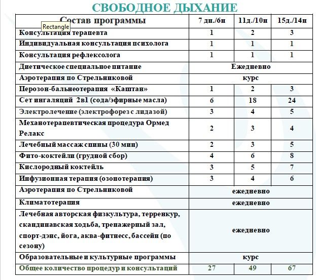 Санаторно-курортный пакет включает: 3-разовое питание, бассейн, ЛФК, контроль за физиологическими показателями, психологические тренинги, аэротерапия по Стрельниковой, пользование тренажерным залом, танцетерапия, йога, аквафитнес (по сезону).